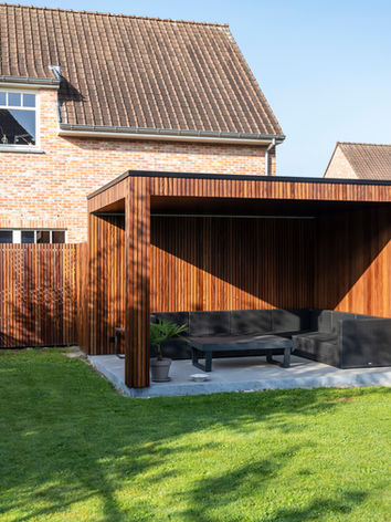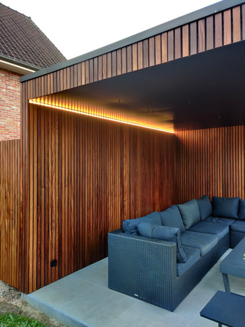 Dit op maat gemaakte bijgebouw combineert verfijning en kwaliteit in elk detail. Er werd gekozen om te werken met duurzame materialen. De onderhoudsarme keramische vloertegel, strakke gevelbekleding uit Afromosia, geïntegreerde deurkader en zwarte aluminium dakrand vormen samen een uitnodigend geheel. Ideaal voor het afsluiten van een drukke werkdag of een ontspannende borrel met vrienden in het weekend. Als kers op de taart werd de buitenzijde voorzien van dimbare sfeerverlichting, waarbij de kleur naar wens kan worden aangepast.